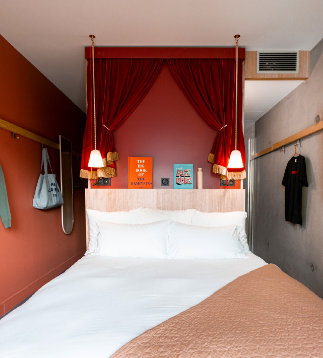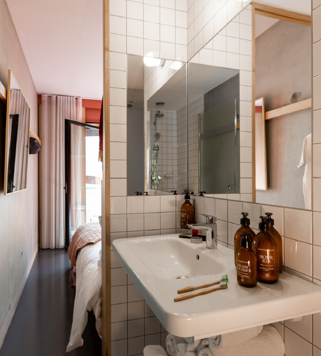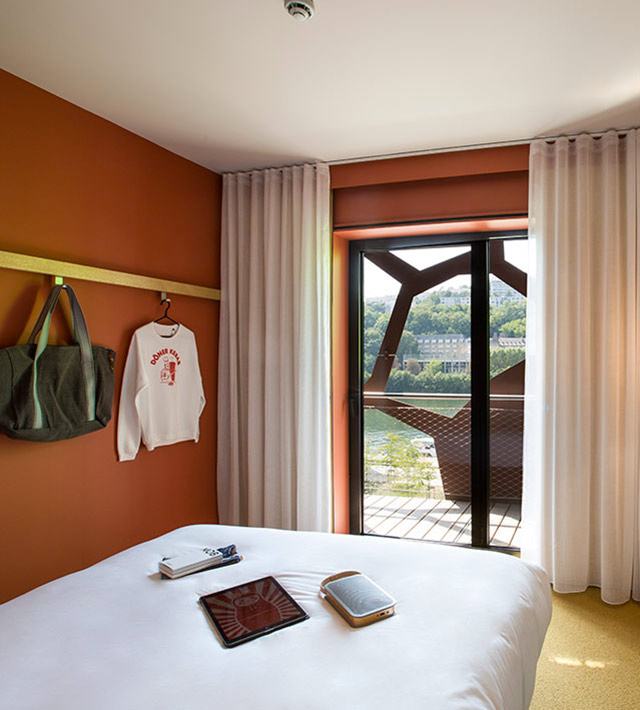 Double room opening onto a balcony with an exceptional view of the Saône River. A bed worthy of the finest palaces: sleeping comfort is not an option! Don't look for a TV here, you'll be disappointed. As an alternative, events, high-speed wifi and books, books, books... In the shower, organic, natural and handmade cosmetics for MOB REPUBLIC. Small pets are welcome at MOB.