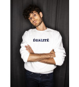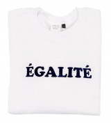 White sweat shirt « Equality » 100% cotton. Made in Paris, le Marais, France in short and responsible manufactured system. An anthem to French lovers, stating the French motto of Republic. Mixed-cut straight sweat shirt with round neck that fits all silhouettes. Velvet message that resist perfectly to washing.